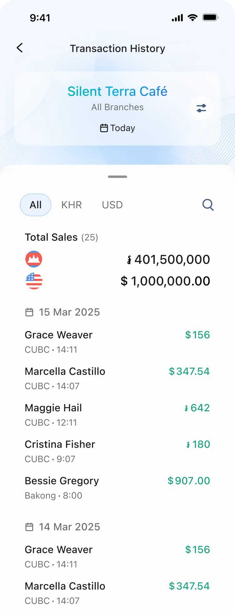 No more end-of-day guesswork. Every transaction is logged the moment it happens — filterable by date, searchable by payer, visible across all branches.