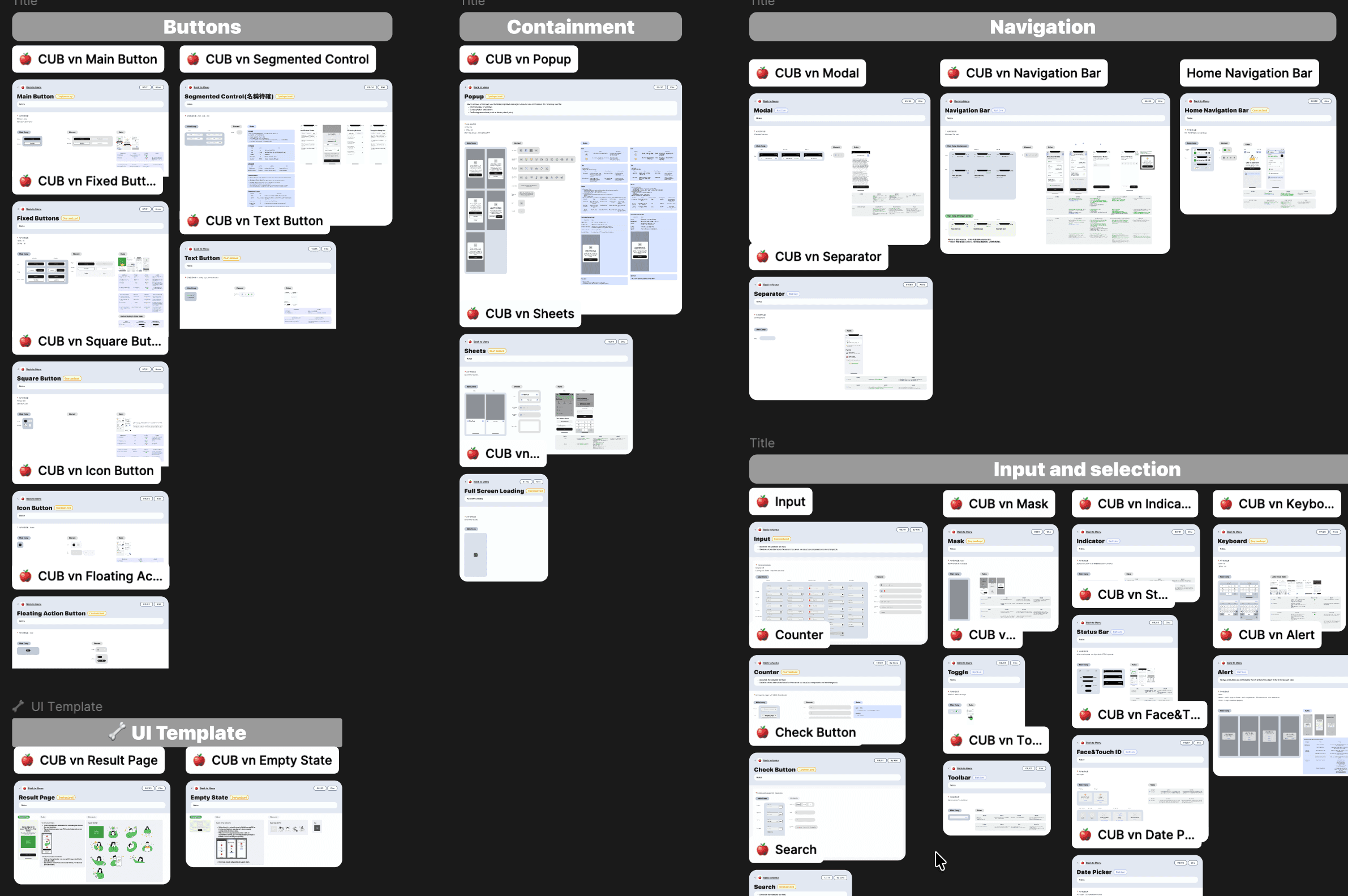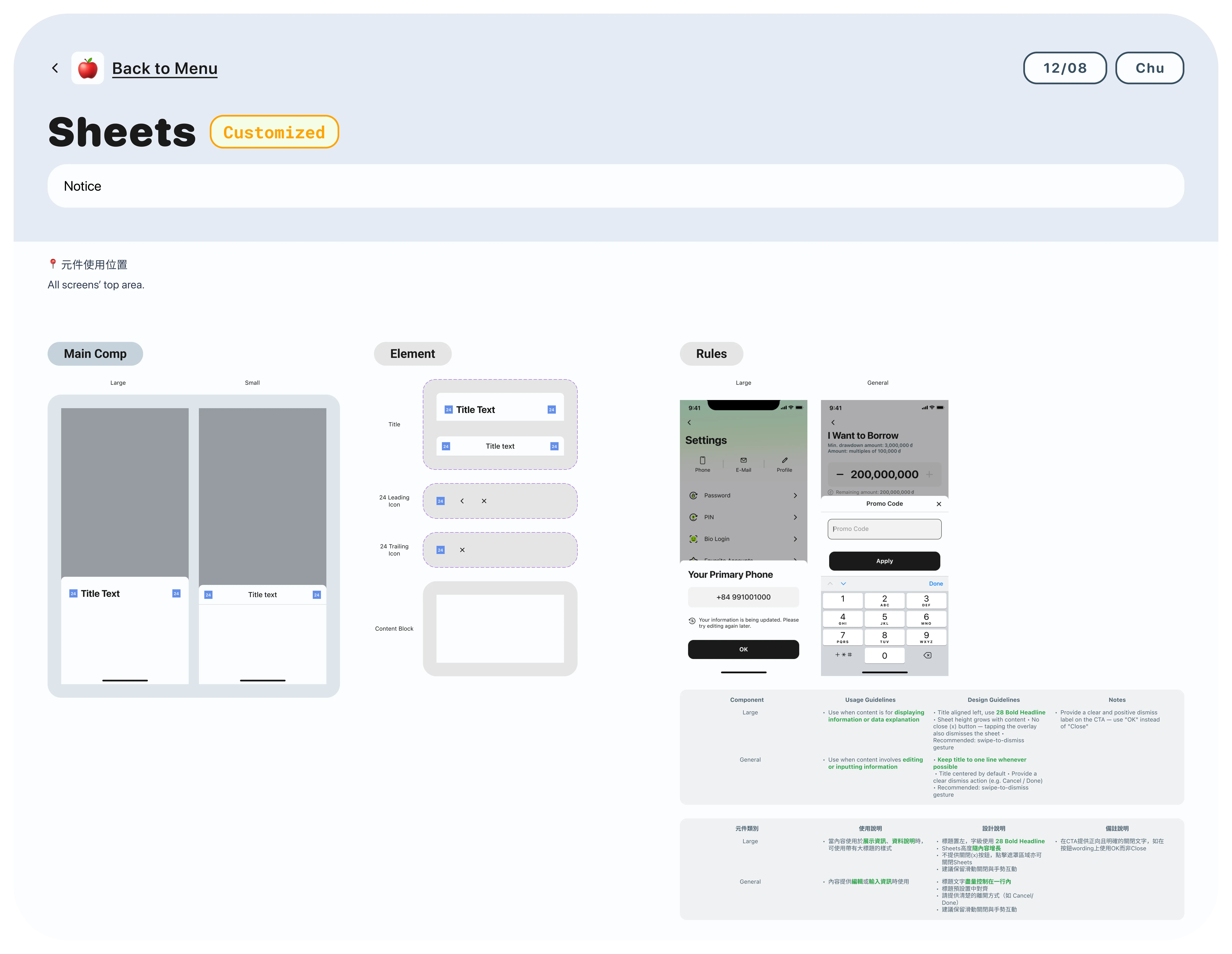 Every component is categorized and ready to deploy. Each entry goes deeper — with Main Comp, Element breakdown, and usage rules that keep designers and developers working from the same source of truth.