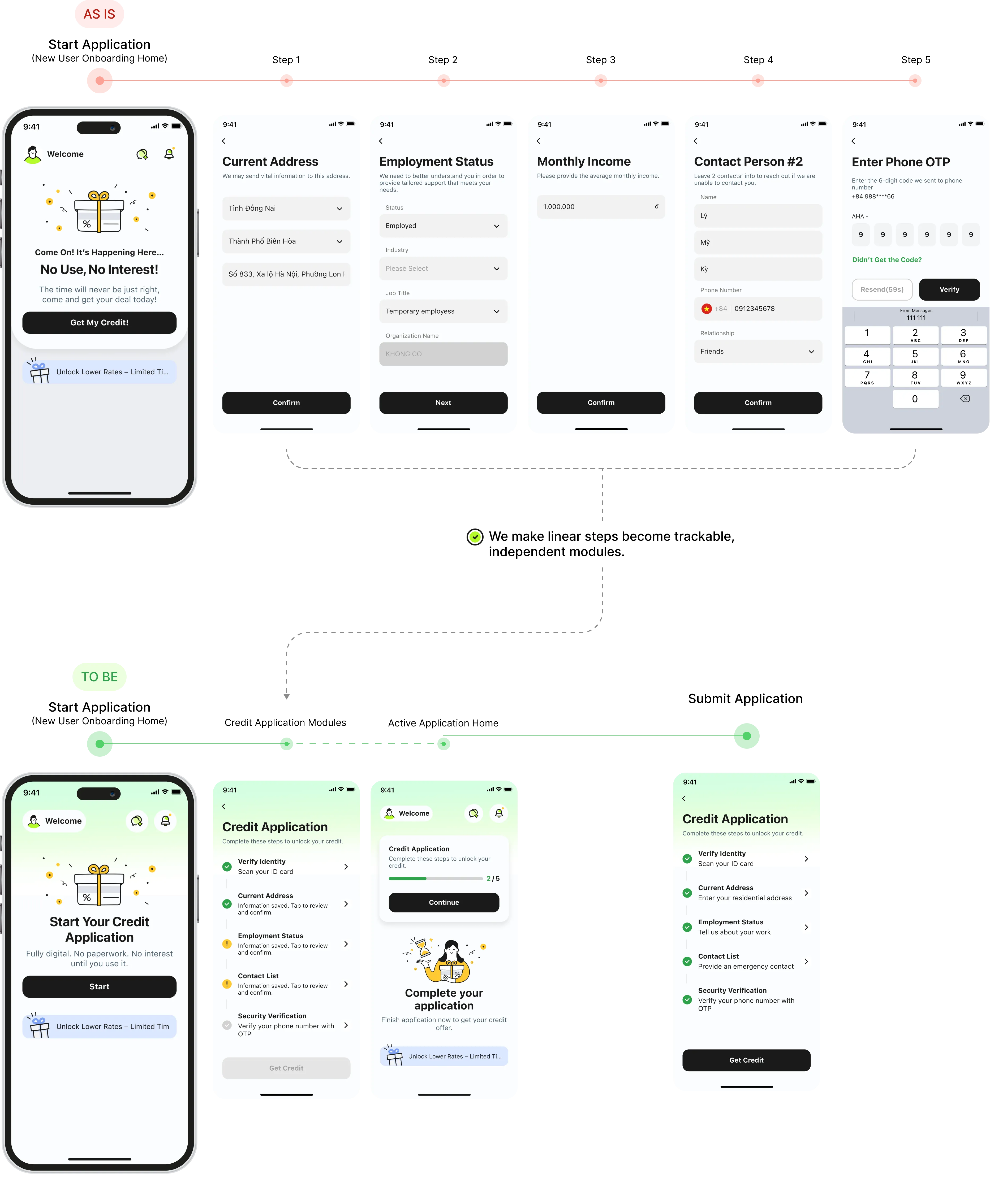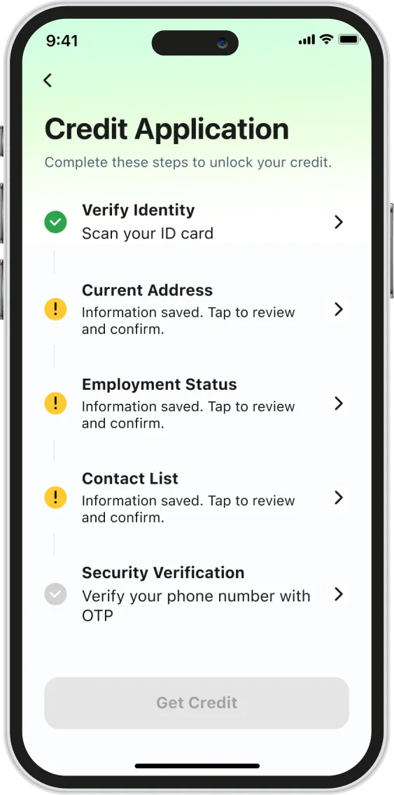Users were dropping off at two critical points — but no one knew exactly why. The credit application flow had too many steps users couldn't navigate alone. The verification step was hitting a hardware wall: users without NFC-enabled phones couldn't proceed at all. Both problems were invisible in the metrics until we dug in. This case covers Chapter 01 — fixing the application flow. Chapter 02 tackles the verification gap.