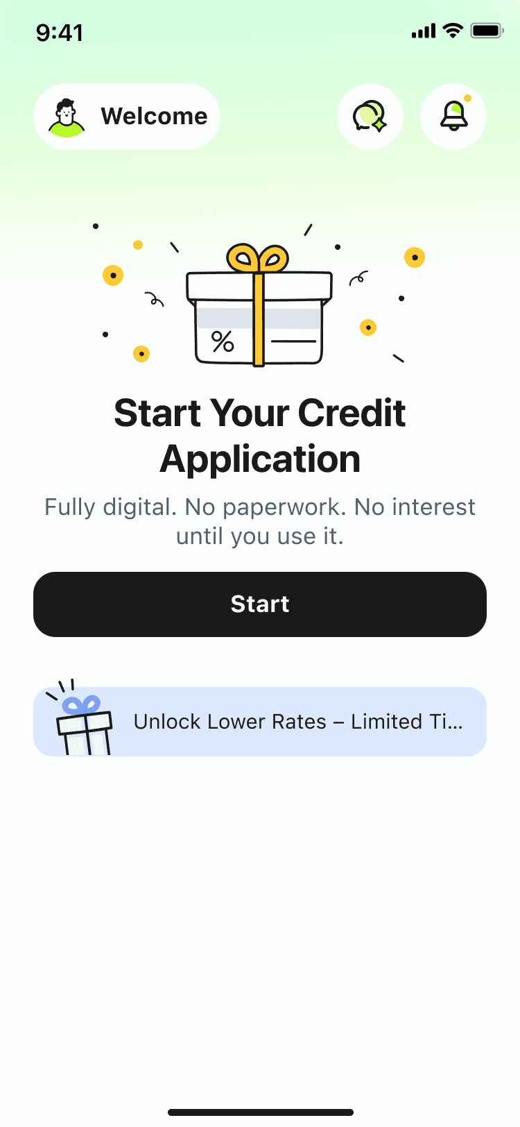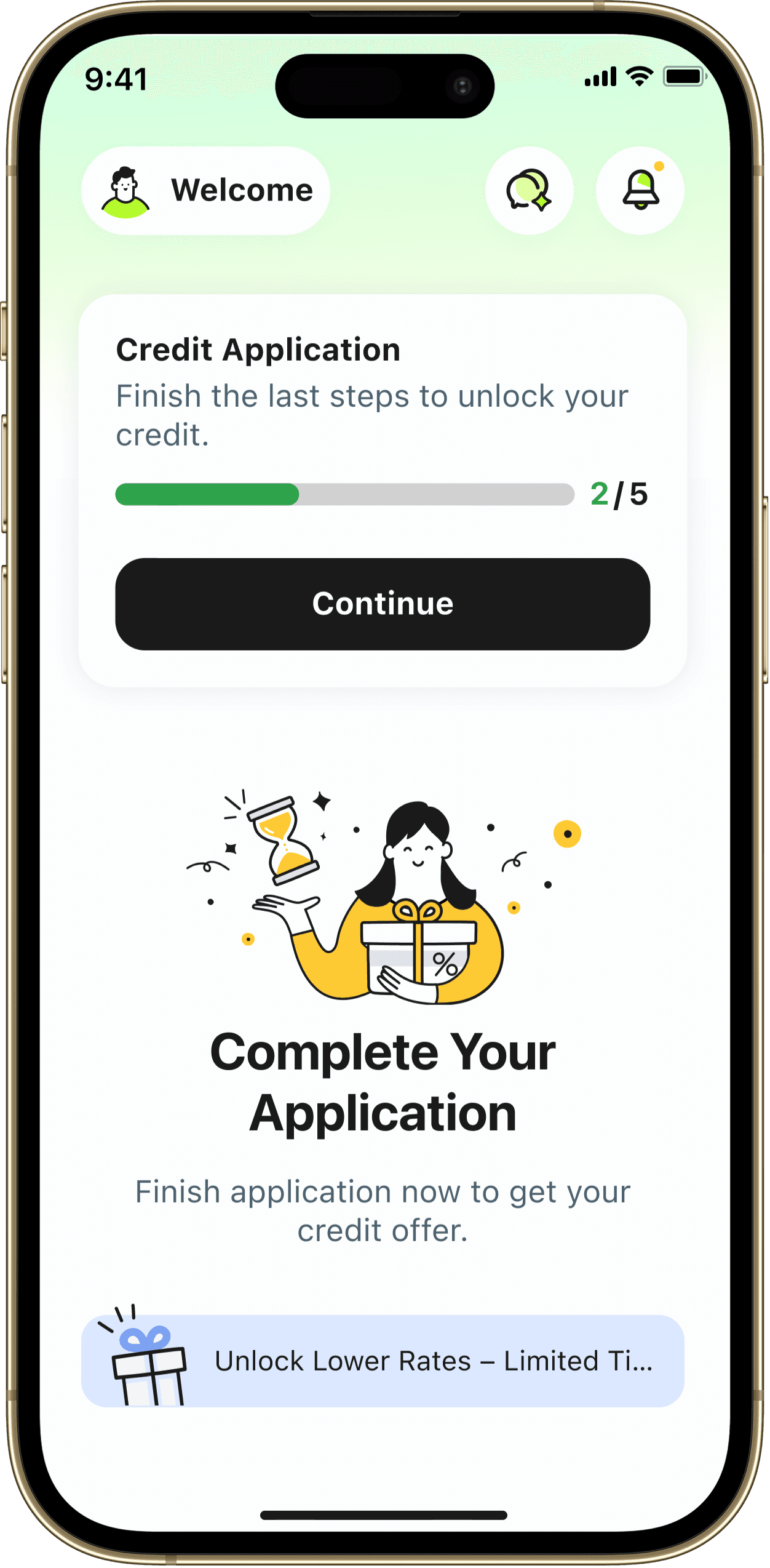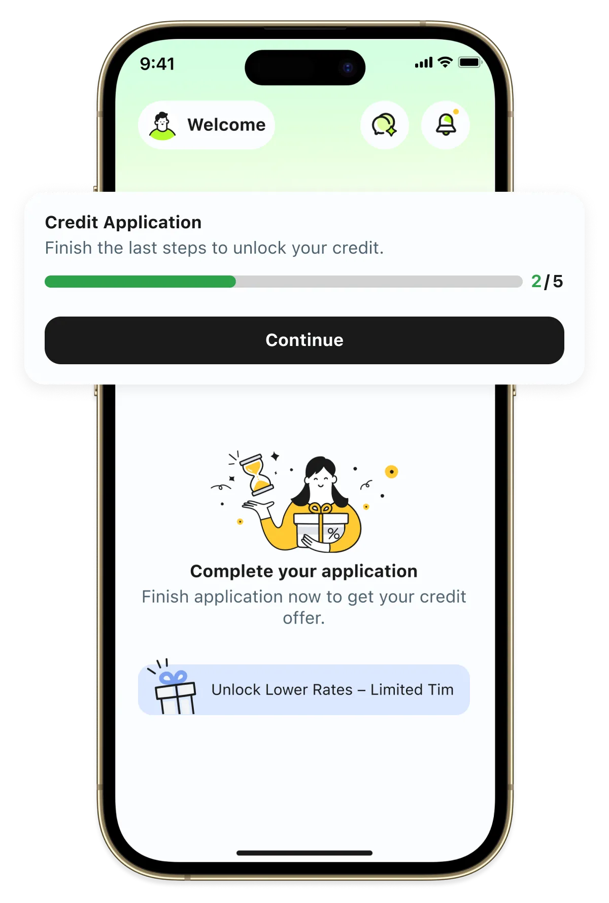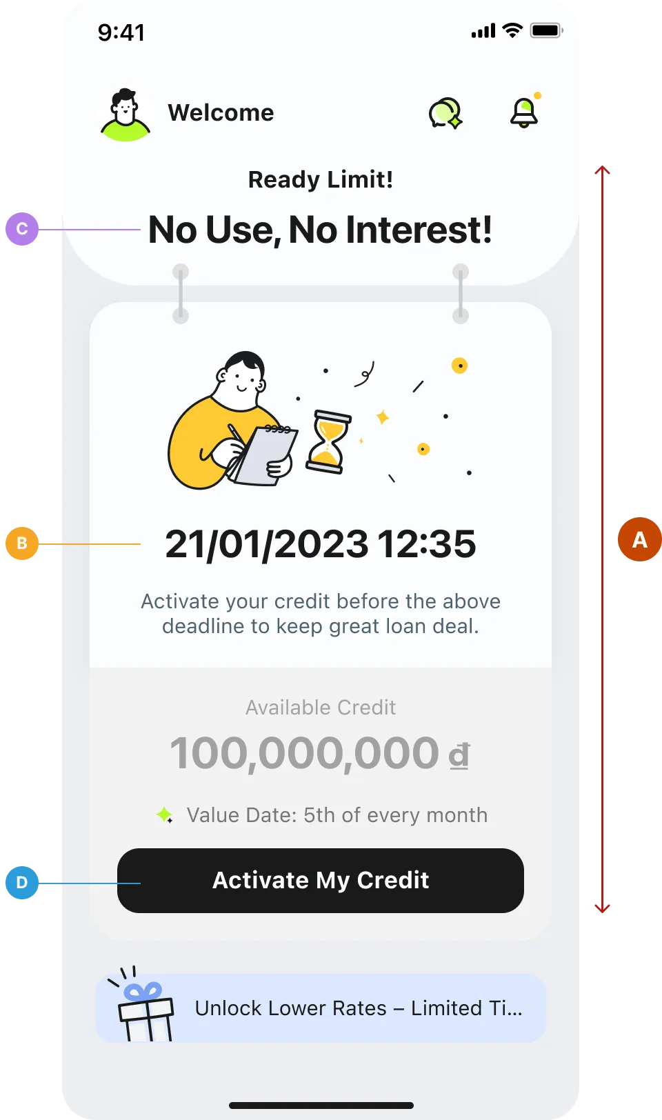 No visual priority — illustration, countdown, credit amount, and promo banner all compete for attention. Nothing tells users what matters most.