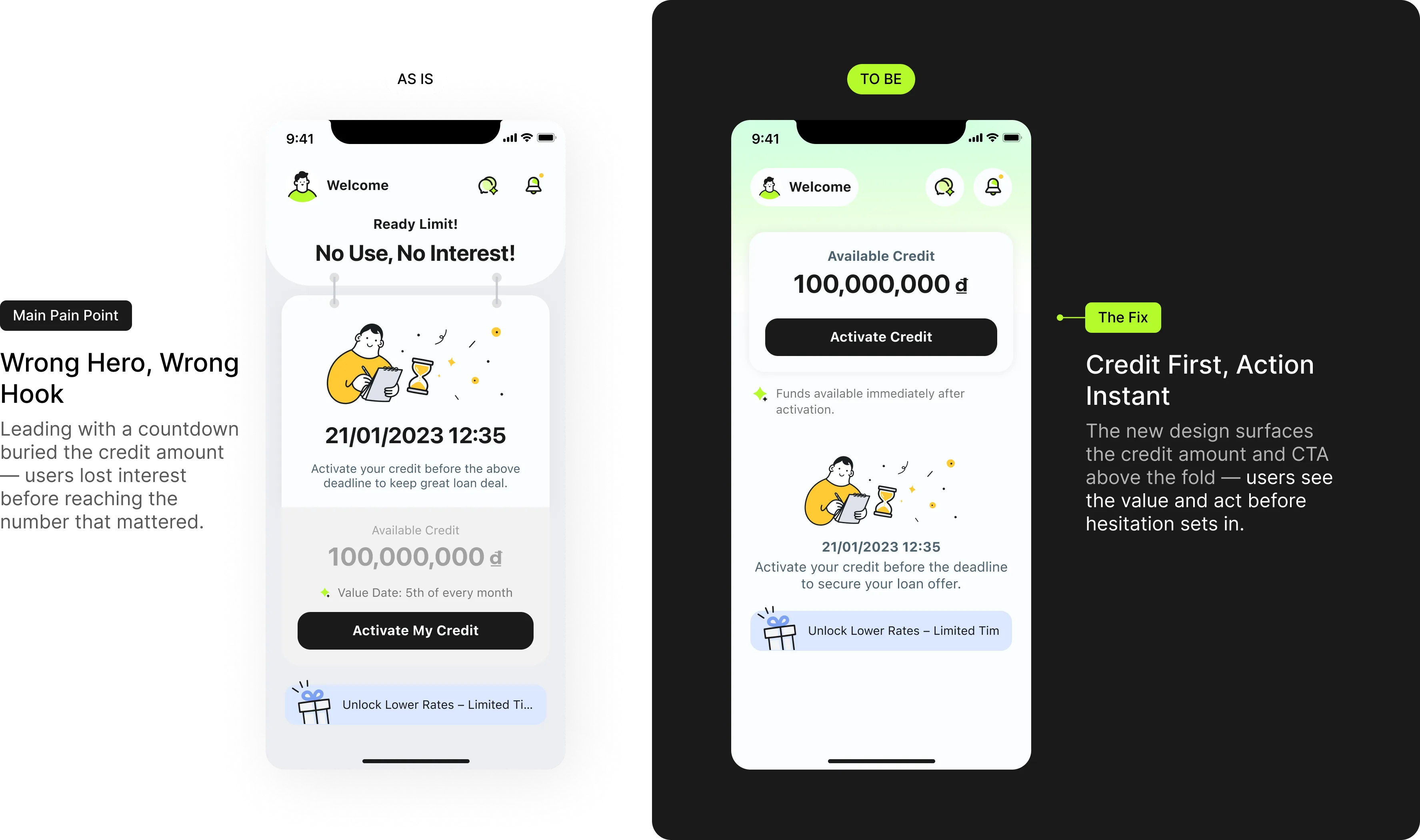 The old page threw everything at users at once — timer, amount, illustration, CTA — and none of it landed. The redesign puts one number front and center, so users know exactly what they're getting before they're asked to act.