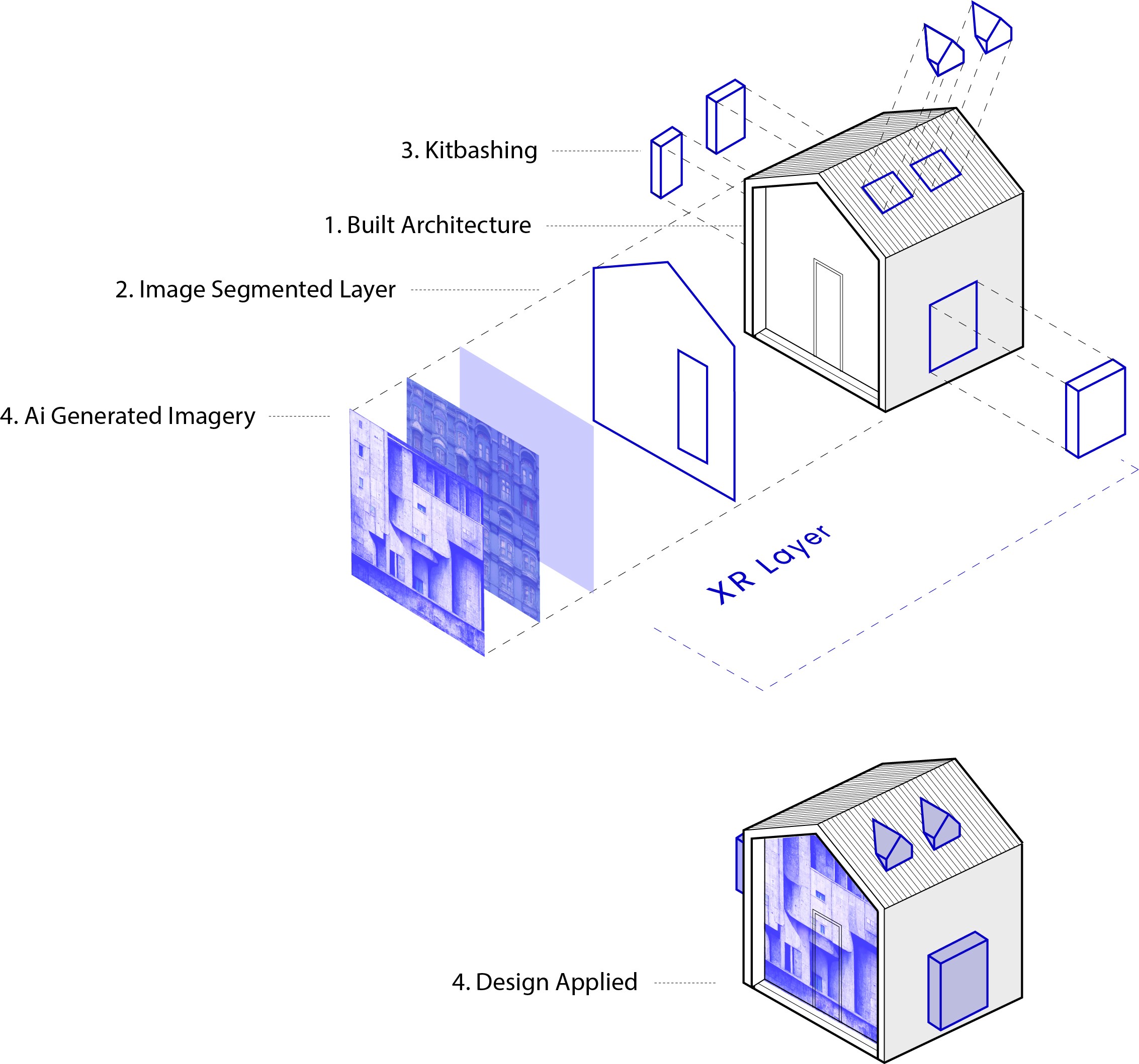 Three pillars: AI generates façades from prompts. Kitbashing lets you remix pre-made 3D modules. A decentralized library keeps the asset ecosystem community-powered.