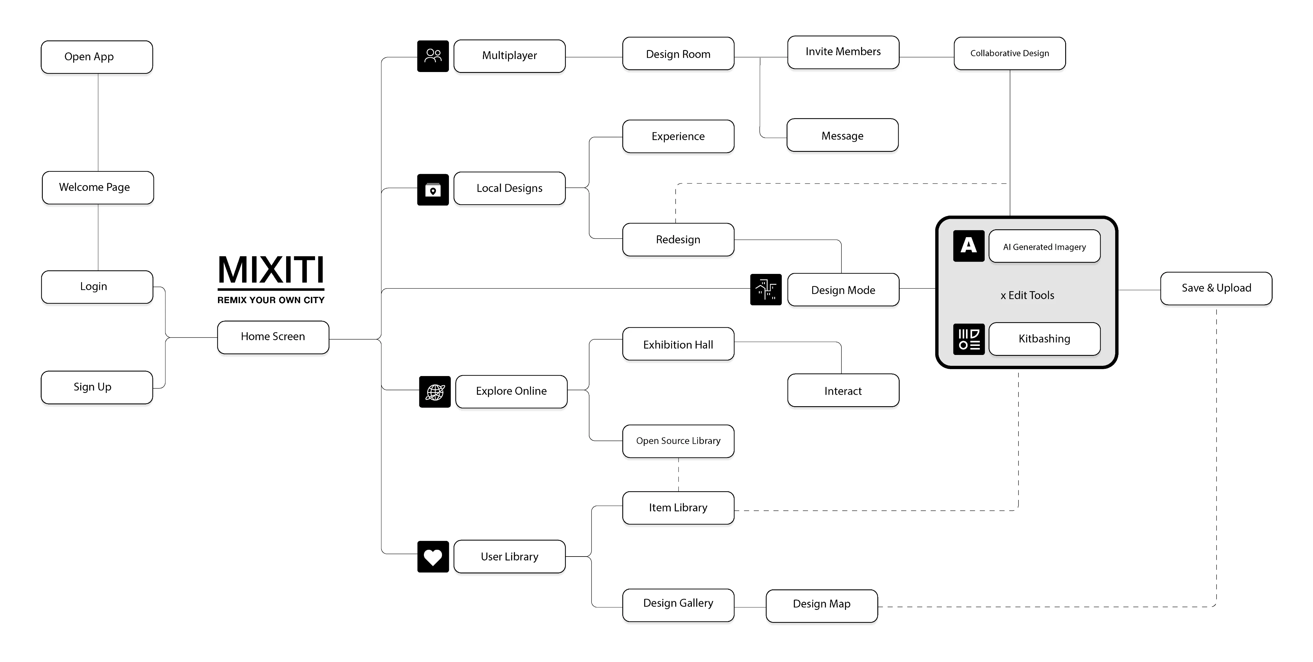 MIXITI's user flow is designed around three entry points — collaborative multiplayer sessions, personal local designs, and open online exploration — all converging into a unified design mode where users can create, remix, and upload their spaces.